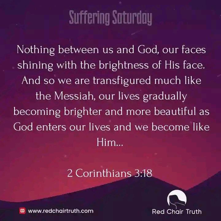 Nothing between us and God, our faces shining with the brightness of His face. And so we are transfigured much like the Messiah, our lives gradually becoming brighter and more beautiful as God enters our lives and we become like Him… 2 Corinthians 3:18.