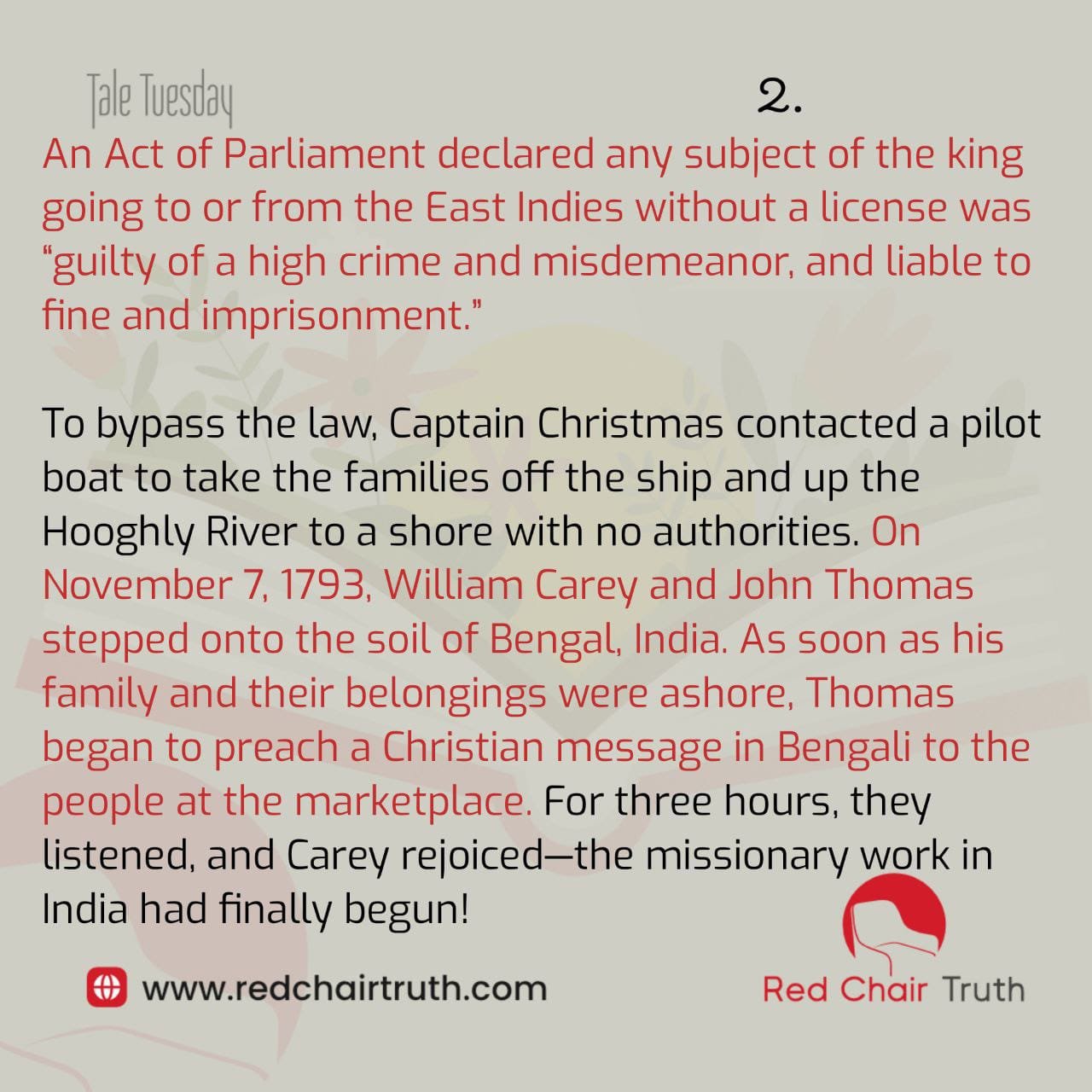 To bypass the law, Captain Christmas contacted a pilot boat to take the families off the ship and up the Hooghly River to a shore with no authorities. On November 7, 1793, William Carey and John Thomas stepped onto the soil of Bengal, India.