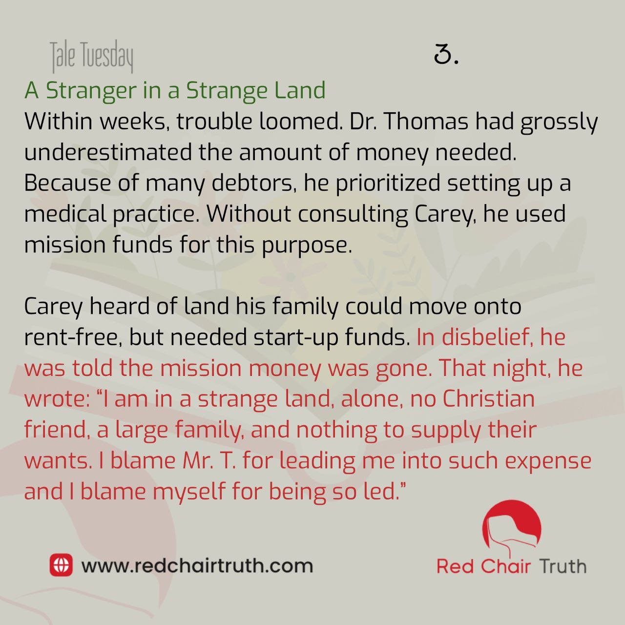 Carey heard of land his family could move onto rent-free but needed start-up funds. In disbelief, he was told the mission money was gone. That night, he wrote: “I am in a strange land, alone, no Christian friend, a large family, and nothing to supply their wants. I blame Mr. T. for leading me into such expense and I blame myself for being so led.”