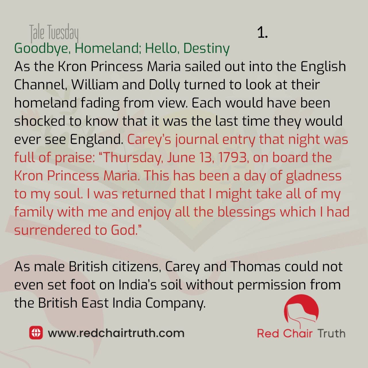 Carey’s journal entry that night was full of praise: “Thursday, June 13, 1793, on board the Kron Princess Maria. This has been a day of gladness to my soul. I was returned that I might take all of my family with me and enjoy all the blessings which I had surrendered to God.”