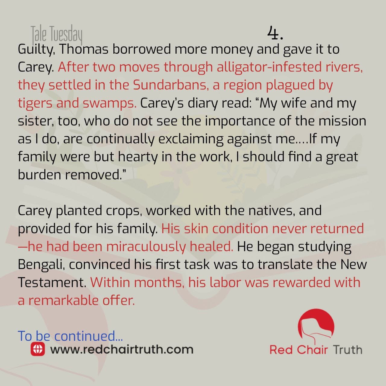 Carey planted crops, worked with the natives, and provided for his family. His skin condition never returned; he had been miraculously healed. He began studying Bengali, convinced his first task was to translate the New Testament. Within months, his labour was rewarded with a remarkable offer.