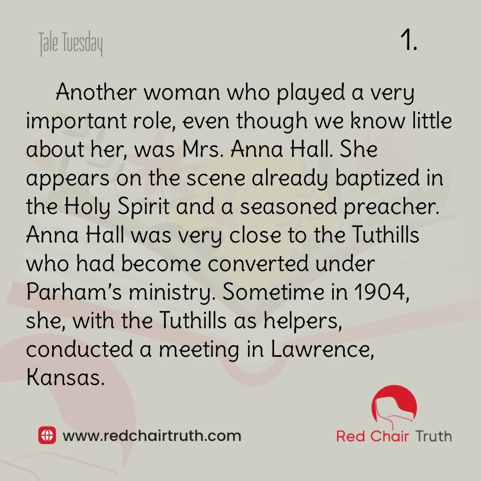 Mrs. Anna Hall was a woman who played a very important role in the early days of the Pentecostal movement, even though we know little about her. She appears on the scene already baptized in the Holy Spirit and a seasoned preacher. Anna Hall was very close to the Tuthills who had become converted under Parham’s ministry.