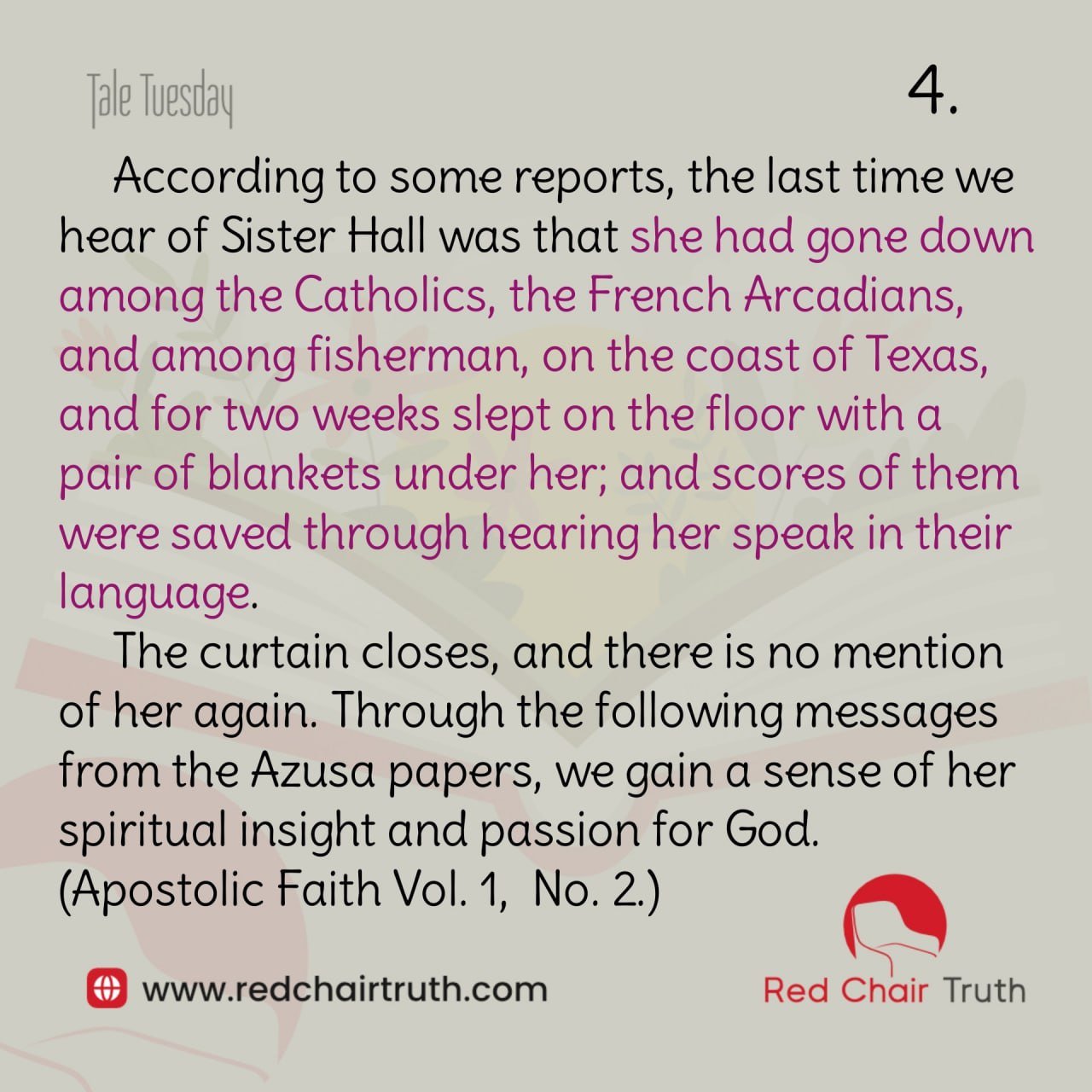 A letter from Seymour to Parham, Aug. 27, 1906 stated, ‘Sister Hall has arrived, and is planning out a great revival in this city that will take place when you come.’ The big meeting, of course, was not to be, but Hall, as well as the Oylers and Quintons, shared in the YMCA meeting after Parham was excluded from Azusa Mission.