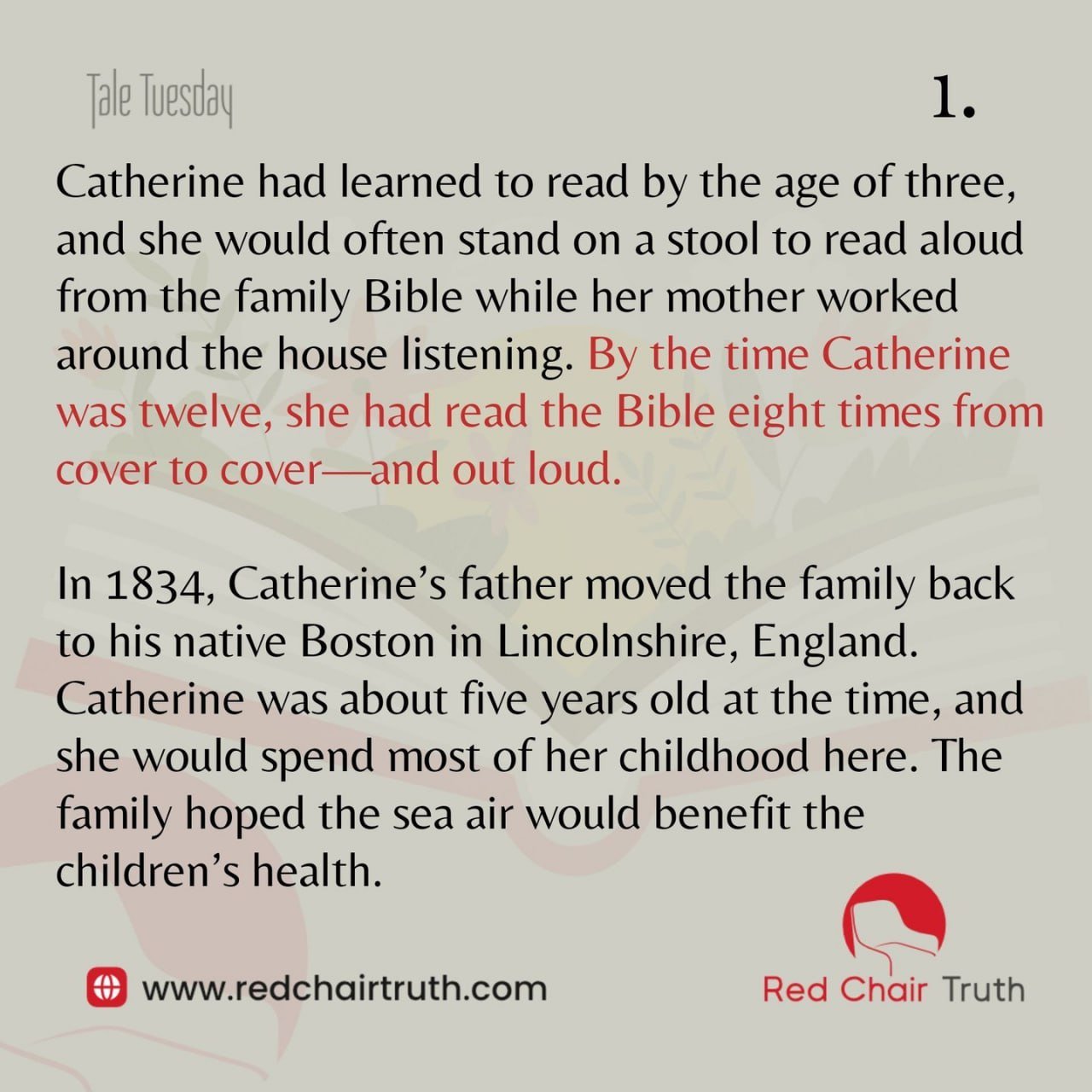 Catherine had learned to read by the age of three, and she would often stand on a stool to read aloud from the family Bible while her mother worked around the house listening. By the time Catherine was twelve, she had read the Bible eight times from cover to cover and out loud.