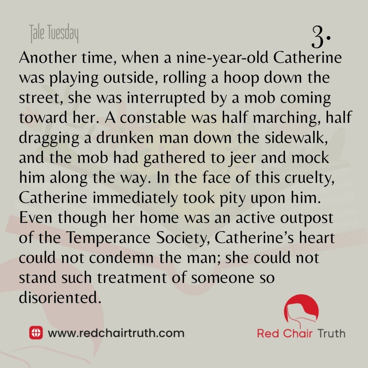 Another time, when a nine-year-old Catherine was playing outside, rolling a hoop down the street, she was interrupted by a mob coming toward her. A constable was half marching, half dragging a drunken man down the sidewalk, and the mob had gathered to jeer and mock him along the way. In the face of this cruelty, Catherine immediately took pity upon him. Even though her home was an active outpost of the Temperance Society, Catherine’s heart could not condemn the man; she could not stand such treatment of someone so disoriented.