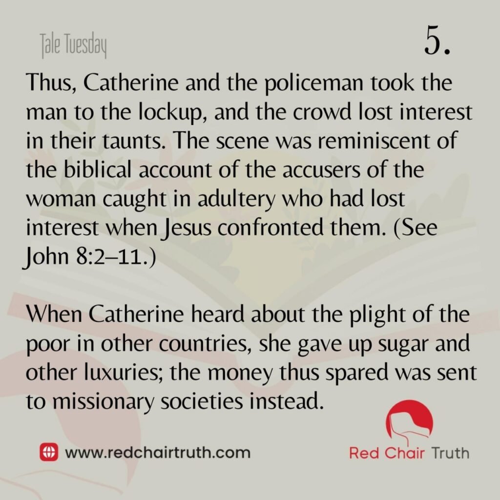 When Catherine heard about the plight of the poor in other countries, she gave up sugar and other luxuries; the money thus spared was sent to missionary societies instead.