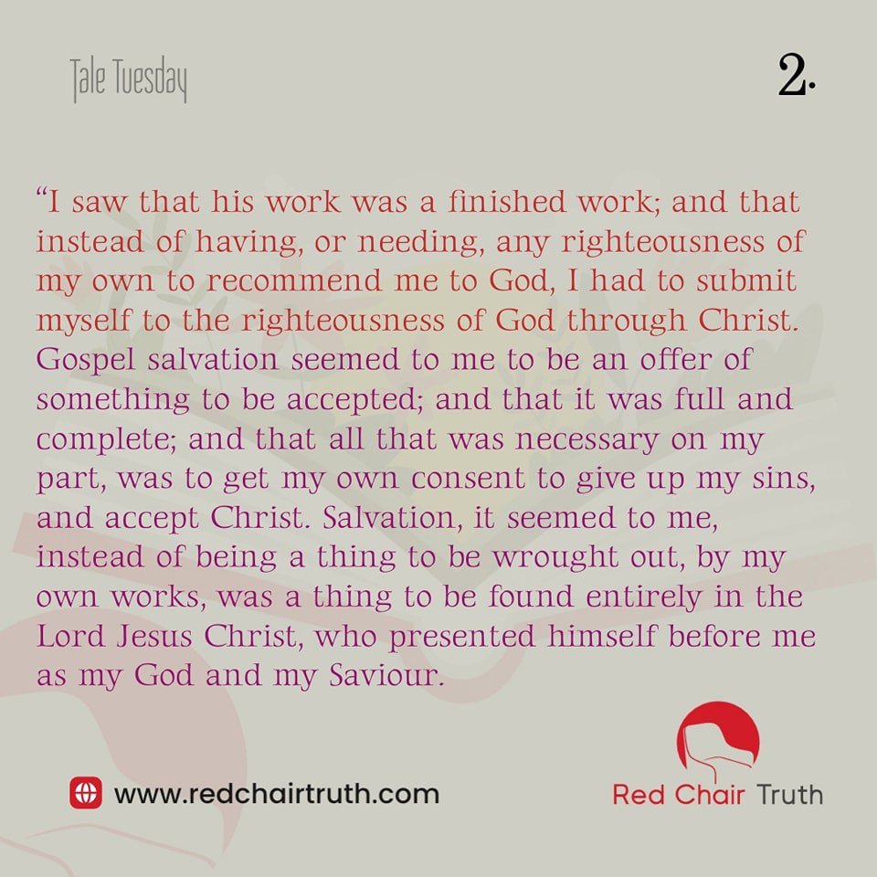“I saw that his work was a finished work; and that instead of having, or needing, any righteousness of my own to recommend me to God, I had to submit myself to the righteousness of God through Christ.