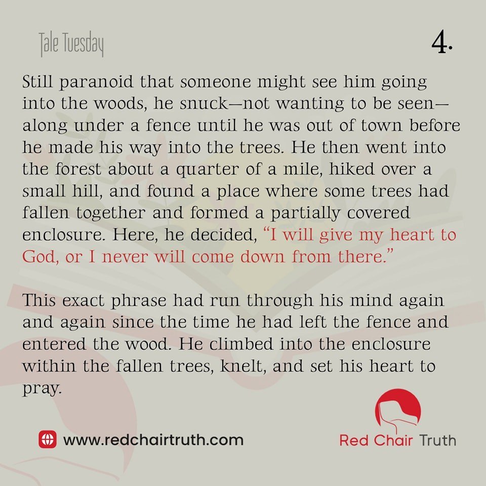 Still paranoid that someone might see him going into the woods, he snuck-not wanting to be seen- along under a fence until he was out of town before he made his way into the trees. He then went into the forest about a quarter of a mile, hiked over a small hill, and found a place where some trees had fallen together and formed a partially covered enclosure. Here, he decided, “I will give my heart to God, or I never will come down from there.”