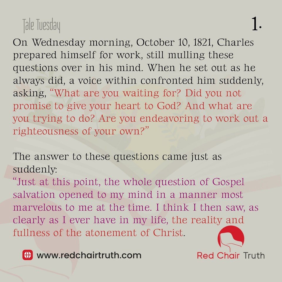 On Wednesday morning, October 10, 1821, Charles prepared himself for work, still mulling these questions over in his mind. When he set out as he always did, a voice within confronted him suddenly, asking, “What are you waiting for? Did you not promise to give your heart to God? And what are you trying to do? Are you endeavoring to work out a righteousness of your own?”