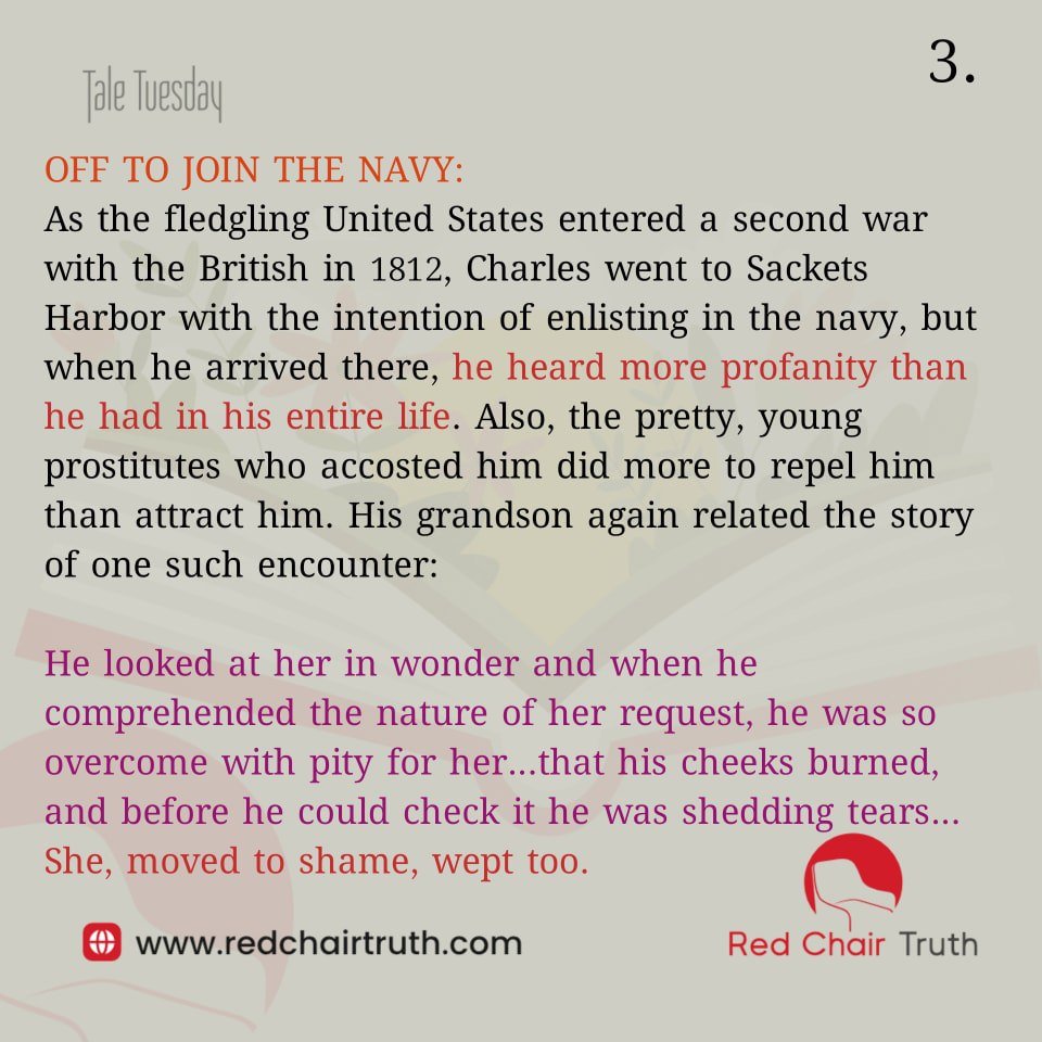 As the fledgling United States entered a second war with the British in 1812, Charles went to Sackets Harbor with the intention of enlisting in the navy, but when he arrived there, he heard more profanity than he had in his entire life. Also, the pretty, young prostitutes who accosted him did more to repel him than attract him. His grandson again related the story of one such encounter: He looked at her in wonder and when he comprehended the nature of her request, he was so overcome with pity for her…that his cheeks burned, and before he could check it he was shedding tears… She, moved to shame, wept too.