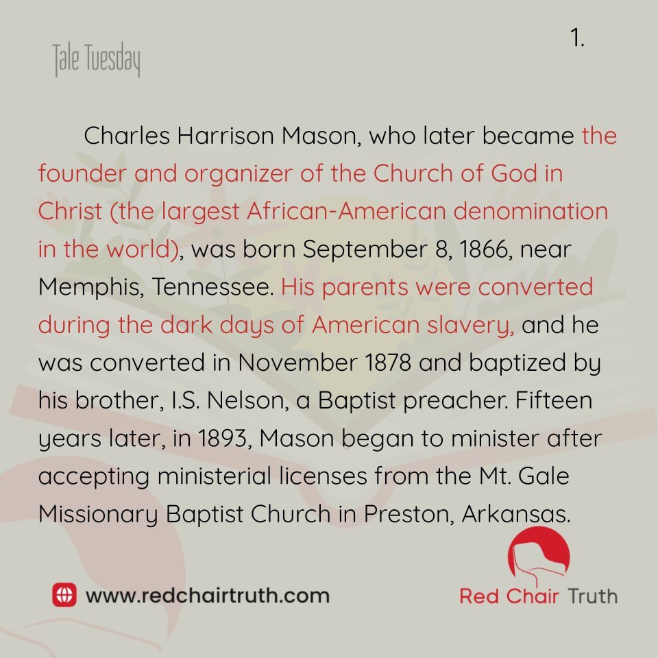 Charles Harrison Mason, who later became the founder and organizer of the Church of God in Christ (the largest African-American denomination in the world), was born September 8, 1866, near Memphis, Tennessee. His parents were converted during the dark days of American slavery, and he was converted in November 1878 and baptized by his brother, I.S. Nelson, a Baptist preacher.