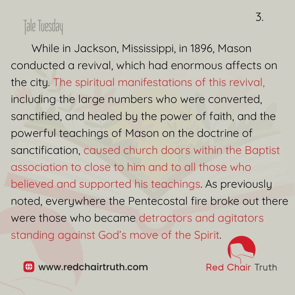 He then returned to preaching and accepted every invitation afforded him. While in Jackson, Mississippi, in 1896, Mason conducted a revival, which had enormous affects on the city. The spiritual manifestations of this revival, including the large numbers who were converted, sanctified, and healed by the power of faith, and the powerful teachings of Mason on the doctrine of sanctification, caused church doors within the Baptist association to close to him and to all those who believed and supported his teachings.