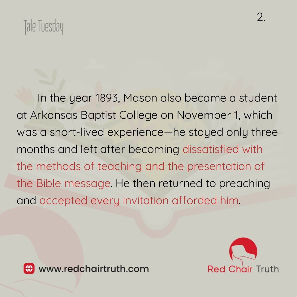 Fifteen years later, in 1893, Mason began to minister after accepting ministerial licenses from the Mt. Gale Missionary Baptist Church in Preston, Arkansas. In the year 1893, Mason also became a student at Arkansas Baptist College on November 1, which was a short-lived experience-he stayed only three months and left after becoming dissatisfied with the methods of teaching and the presentation of the Bible message.