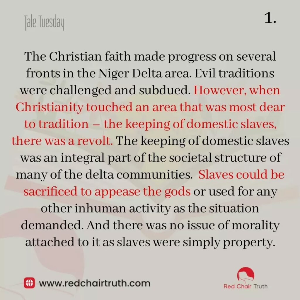 The Christian faith made progress on several fronts in the Niger Delta area. Evil traditions were challenged and subdued. However, when Christianity touched an area that was most dear to tradition – the keeping of domestic slaves, there was a revolt. The keeping of domestic slaves was an integral part of the societal structure of many of the delta communities. Slaves could be sacrificed to appease the gods or used for any other inhuman activity as the situation demanded. And there was no issue of morality attached to it as slaves were simply property.