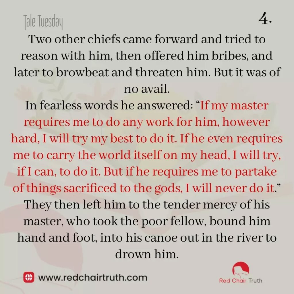 Two other chiefs came forward and tried to reason with him, then offered him bribes, and later to browbeat and threaten him. But it was of no avail. In fearless words he answered: “If my master requires me to do any work for him, however hard, I will try my best to do it. If he even requires me to carry the world itself on my head, I will try, if I can, to do it. But if he requires me to partake of things sacrificed to the gods, I will never do it.” They then left him to the tender mercy of his master, who took the poor fellow, bound him hand and foot, into his canoe out in the river to drown him.