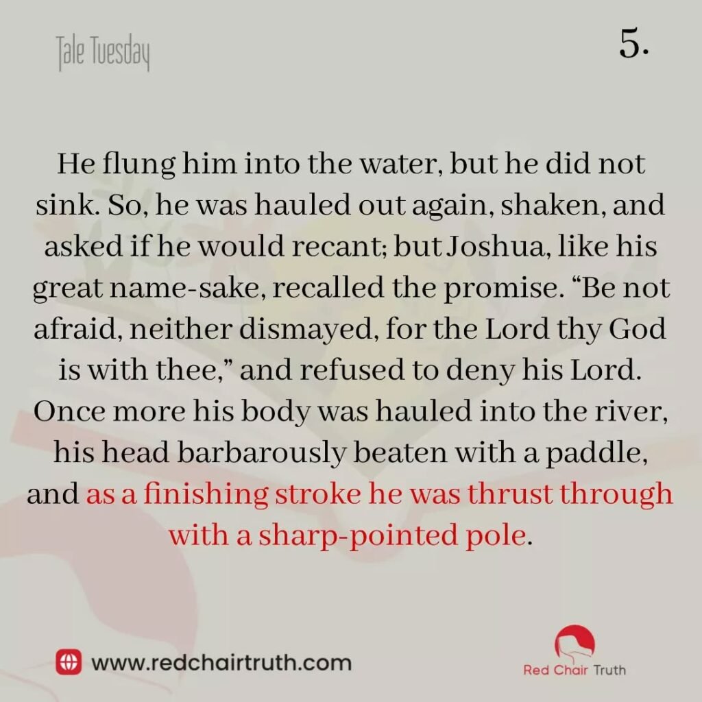 He flung him into the water, but he did not sink. So, he was hauled out again, shaken, and asked if he would recant; but Joshua, like his great name-sake, recalled the promise. “Be not afraid, neither dismayed, for the Lord thy God is with thee,” and refused to deny his Lord. Once more his body was hauled into the river, his head barbarously beaten with a paddle, and as a finishing stroke he was thrust through with a sharp-pointed pole.