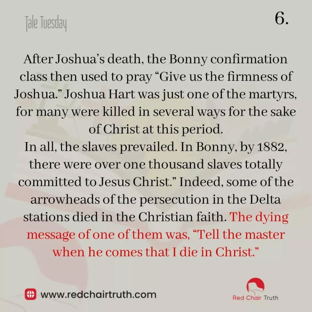 After Joshua’s death, the Bonny confirmation class then used to pray “Give us the firmness of Joshua.” Joshua Hart was just one of the martyrs, for many were killed in several ways for the sake of Christ at this period. In all, the slaves prevailed. In Bonny, by 1882, there were over one thousand slaves totally committed to Jesus Christ.” Indeed, some of the arrowheads of the persecution in the Delta stations died in the Christian faith. The dying message of one of them was, “Tell the master when he comes that I die in Christ.”