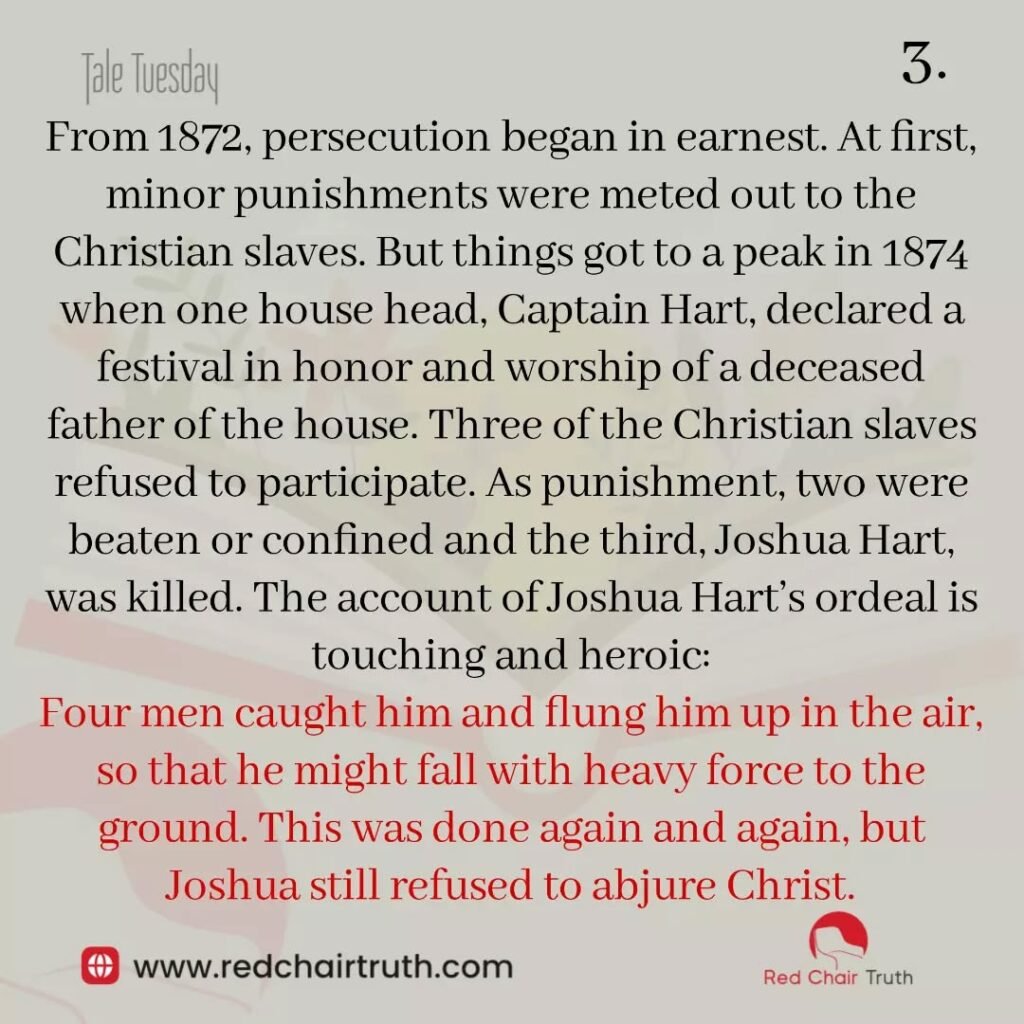 From 1872, persecution began in earnest. At first, minor punishments were meted out to the Christian slaves. But things got to a peak in 1874 when one house head, Captain Hart, declared a festival in honor and worship of a deceased father of the house. Three of the Christian slaves refused to participate. As punishment, two were beaten or confined and the third, Joshua Hart, was killed. The account of Joshua Hart’s ordeal is touching and heroic: Four men caught him and flung him up in the air, so that he might fall with heavy force to the ground. This was done again and again, but Joshua still refused to abjure Christ.