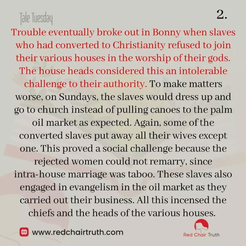 Trouble eventually broke out in Bonny when slaves who had converted to Christianity refused to join their various houses in the worship of their gods. The house heads considered this an intolerable challenge to their authority. To make matters worse, on Sundays, the slaves would dress up and go to church instead of pulling canoes to the palm oil market as expected. Again, some of the converted slaves put away all their wives except one. This proved a social challenge because the rejected women could not remarry, since intra-house marriage was taboo. These slaves also engaged in evangelism in the oil market as they carried out their business. All this incensed the chiefs and the heads of the various houses.