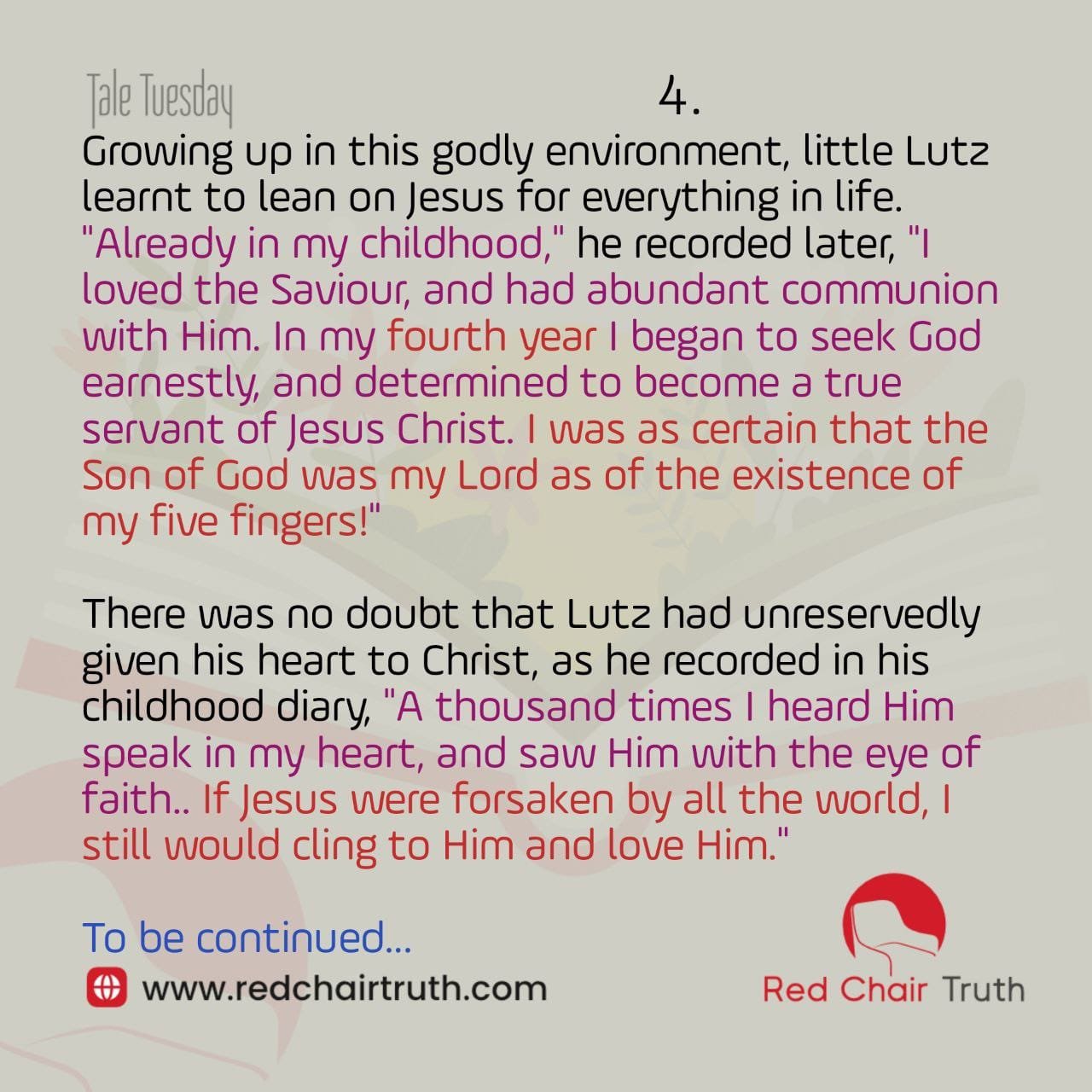 Growing up in this godly environment, little Lutz learnt to lean on Jesus for everything in life. “Already in my childhood,” he recorded later, “I loved the Saviour, and had abundant communion with Him. In my fourth year I began to seek God earnestly, and determined to become a true servant of Jesus Christ. I was as certain that the Son of God was my Lord as of the existence of my five fingers!” There was no doubt that Lutz had unreservedly given his heart to Christ, as he recorded in his childhood diary, “A thousand times I heard Him speak in my heart, and saw Him with the eye of faith.. If Jesus were forsaken by all the world, I still would cling to Him and love Him.”