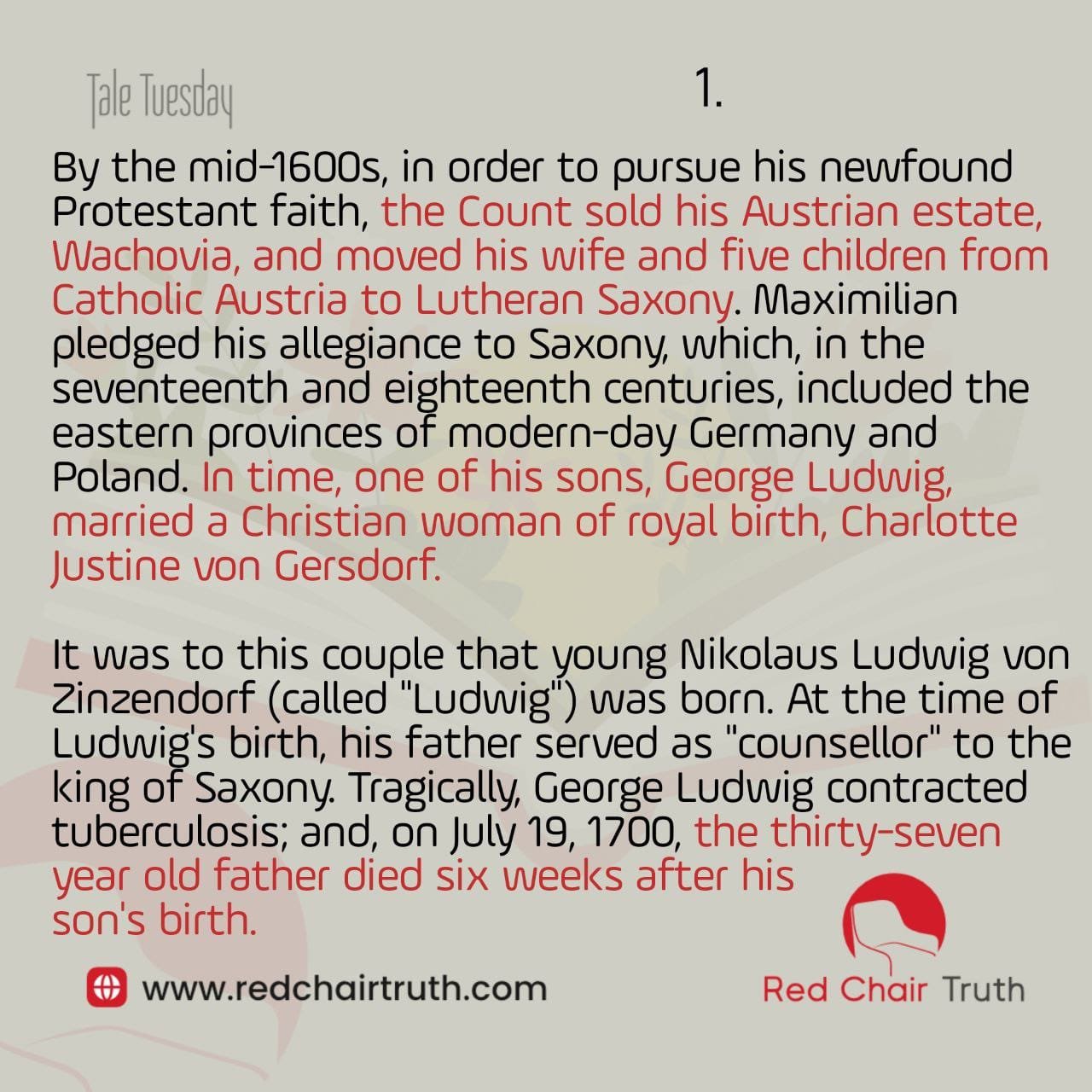 By the mid-1600s, in order to pursue his newfound Protestant faith, the Count sold his Austrian estate, Wachovia, and moved his wife and five children from Catholic Austria to Lutheran Saxony. Maximilian pledged his allegiance to Saxony, which, in the seventeenth and eighteenth centuries, included the eastern provinces of modern-day Germany and Poland. In time, one of his sons, George Ludwig, married a Christian woman of royal birth, Charlotte Justine von Gersdorf. It was to this couple that young Nikolaus Ludwig von Zinzendorf (called “Ludwig”) was born. At the time of Ludwig’s birth, his father served as “counsellor” to the king of Saxony. Tragically, George Ludwig contracted tuberculosis; and, on July 19, 1700, the thirty-seven year old father died six weeks after his son’s birth.