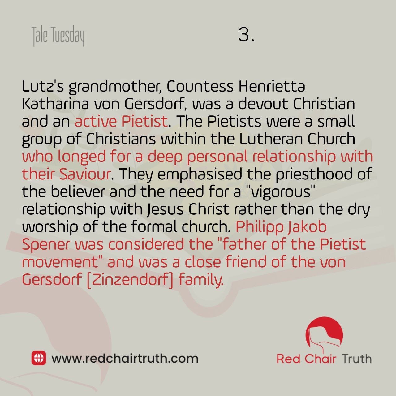 Lutz’s grandmother, Countess Henrietta Katharina von Gersdorf, was a devout Christian and an active Pietist. The Pietists were a small group of Christians within the Lutheran Church who longed for a deep personal relationship with their Saviour. They emphasised the priesthood of the believer and the need for a “vigorous” relationship with Jesus Christ rather than the dry worship of the formal church. Philipp Jakob Spener was considered the “father of the Pietist movement” and was a close friend of the von Gersdorf [Zinzendorf] family.