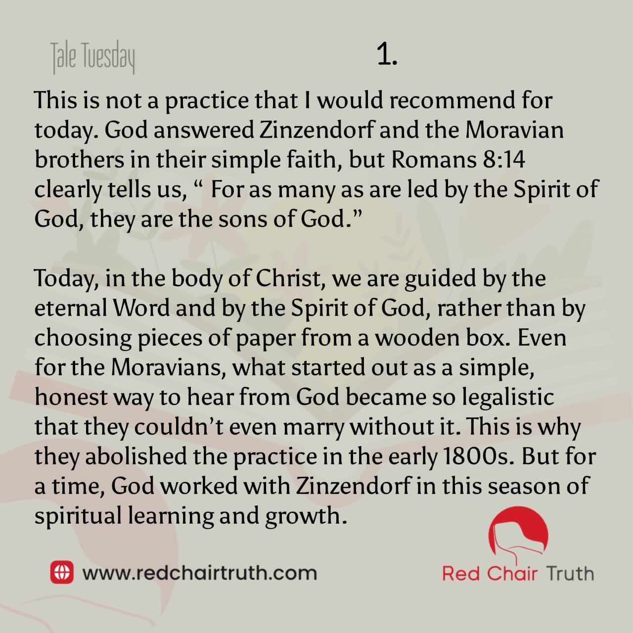 This is not a practice that I would recommend for today. God answered Zinzendorf and the Moravian brothers in their simple faith, but Romans 8:14 clearly tells us, “For as many as are led by the Spirit of God, they are the sons of God.” Today, in the body of Christ, we are guided by the eternal Word and by the Spirit of God, rather than by choosing pieces of paper from a wooden box. Even for the Moravians, what started out as a simple, honest way to hear from God became so legalistic that they couldn’t even marry without it. This is why they abolished the practice in the early 1800s. But for a time, God worked with Zinzendorf in this season of spiritual learning and growth.