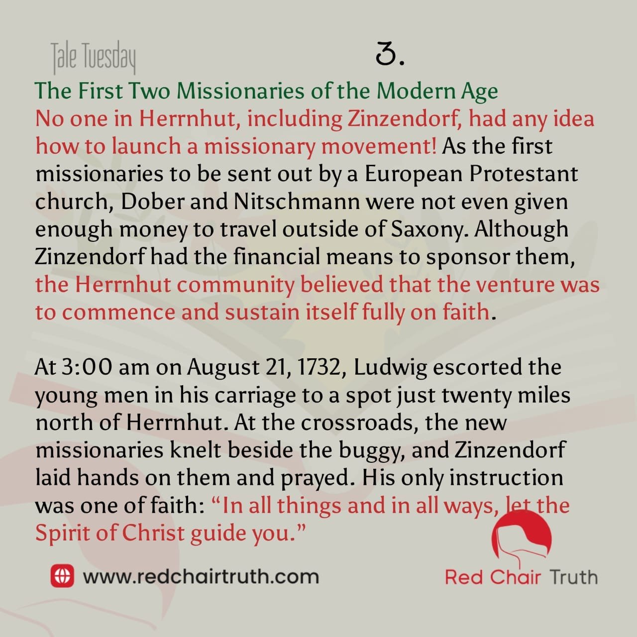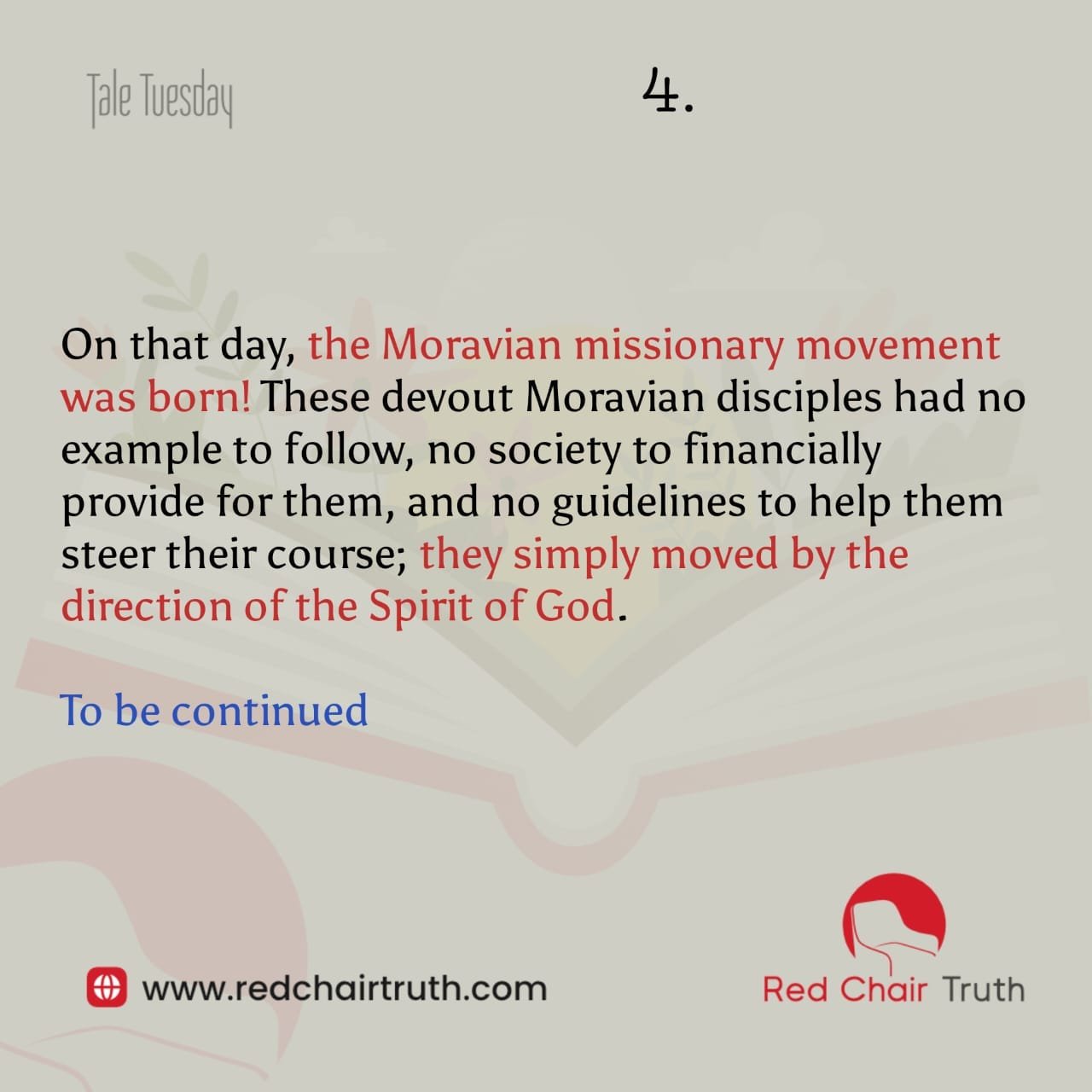On that day, the Moravian missionary movement was born! These devout Moravian disciples had no example to follow, no society to financially provide for them, and no guidelines to help them steer their course; they simply moved by the direction of the Spirit of God.