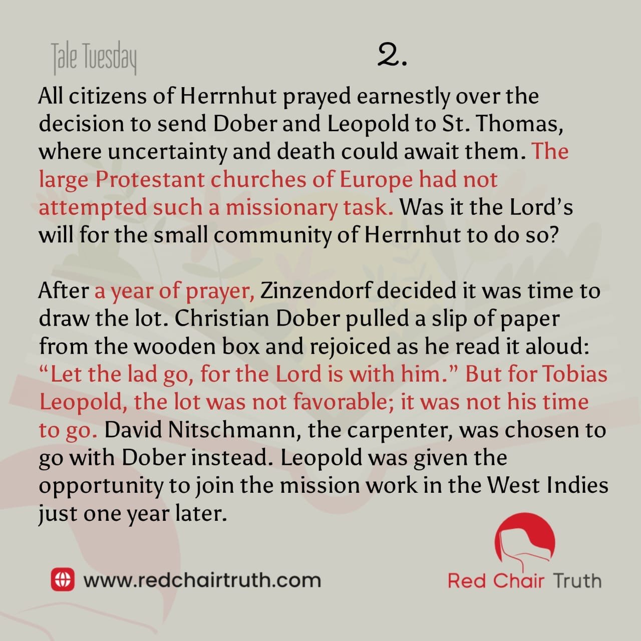 All citizens of Herrnhut prayed earnestly over the decision to send Dober and Leopold to St. Thomas, where uncertainty and death could await them. The large Protestant churches of Europe had not attempted such a missionary task. Was it the Lord’s will for the small community of Herrnhut to do so? After a year of prayer, Zinzendorf decided it was time to draw the lot. Christian Dober pulled a slip of paper from the wooden box and rejoiced as he read it aloud: “Let the lad go, for the Lord is with him.” But for Tobias Leopold, the lot was not favorable; it was not his time to go. David Nitschmann, the carpenter, was chosen to go with Dober instead. Leopold was given the opportunity to join the mission work in the West Indies just one year later.