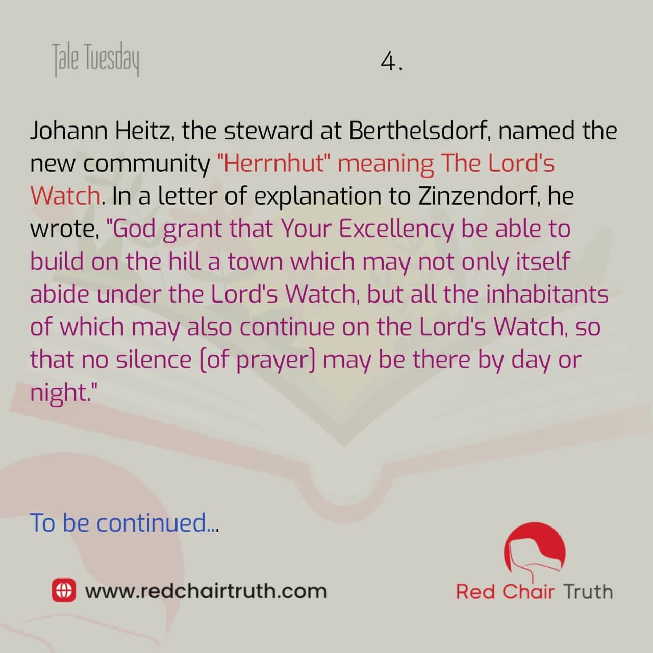 Johann Heitz, the steward at Berthelsdorf, named the new community “Herrnhut” meaning The Lord’s Watch. In a letter of explanation to Zinzendorf, he wrote, “God grant that Your Excellency be able to build on the hill a town which may not only itself abide under the Lord’s Watch, but all the inhabitants of which may also continue on the Lord’s Watch, so that no silence (of prayer) may be there by day or night.”