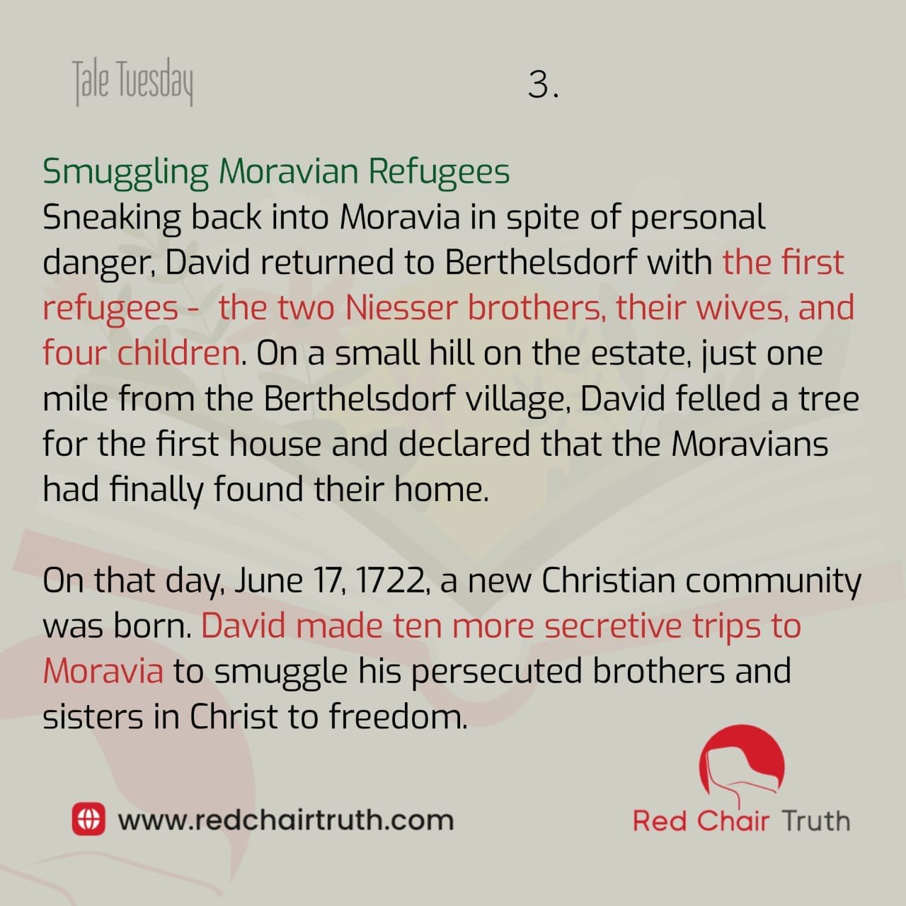 Sneaking back into Moravia in spite of personal danger, David returned to Berthelsdorf with the first refugees – the two Niesser brothers, their wives, and four children. On a small hill on the estate, just one mile from the Berthelsdorf village, David felled a tree for the first house and declared that the Moravians had finally found their home. On that day, June 17, 1722, a new Christian community was born. David made ten more secretive trips to Moravia to smuggle his persecuted brothers and sisters in Christ to freedom.