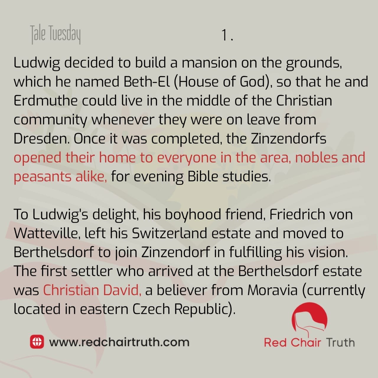 Ludwig decided to build a mansion on the grounds, which he named Beth-El (House of God), so that he and Erdmuthe could live in the middle of the Christian community whenever they were on leave from Dresden. Once it was completed, the Zinzendorfs opened their home to everyone in the area, nobles and peasants alike, for evening Bible studies. To Ludwig’s delight, his boyhood friend, Friedrich von Watteville, left his Switzerland estate and moved to Berthelsdorf to join Zinzendorf in fulfilling his vision. The first settler who arrived at the Berthelsdorf estate was Christian David, a believer from Moravia (currently located in eastern Czech Republic).