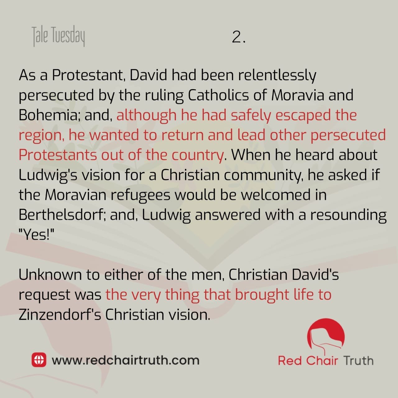 As a Protestant, David had been relentlessly persecuted by the ruling Catholics of Moravia and Bohemia; and, although he had safely escaped the region, he wanted to return and lead other persecuted Protestants out of the country. When he heard about Ludwig’s vision for a Christian community, he asked if the Moravian refugees would be welcomed in Berthelsdorf; and, Ludwig answered with a resounding “Yes!” Unknown to either of the men, Christian David’s request was the very thing that brought life to Zinzendorf’s Christian vision.