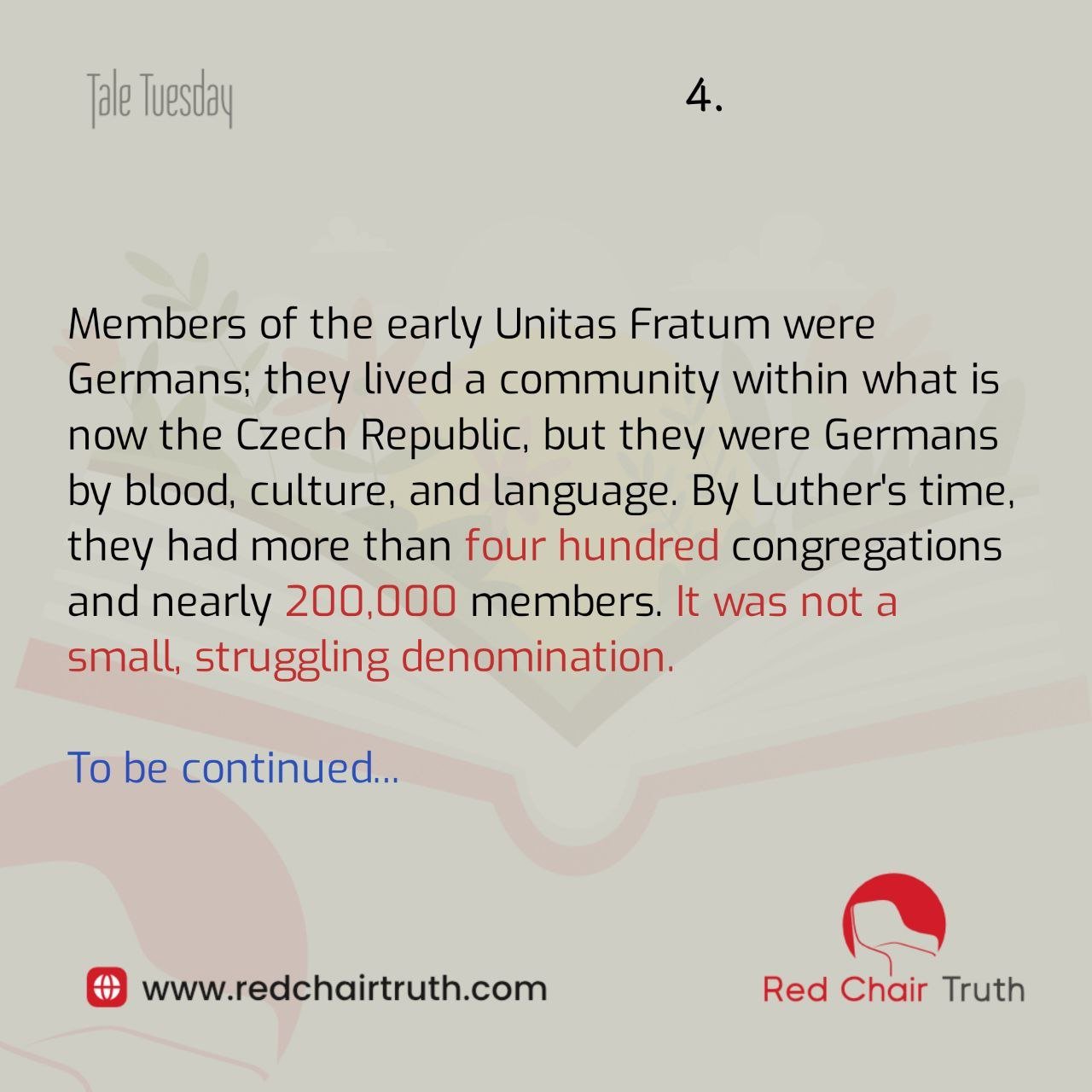 Members of the early Unitas Fratum were Germans; they lived a community within what is now the Czech Republic, but they were Germans by blood, culture, and language. By Luther’s time, they had more than four hundred congregations and nearly 200,000 members. It was not a small, struggling denomination.