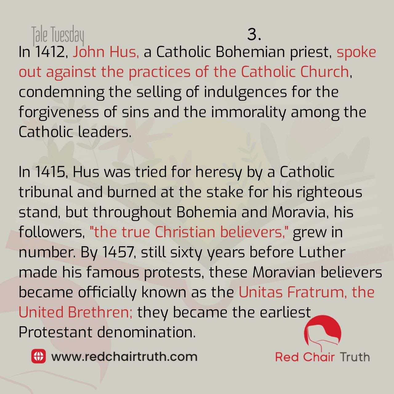 In 1412, John Hus, a Catholic Bohemian priest, spoke out against the practices of the Catholic Church, condemning the selling of indulgences for the forgiveness of sins and the immorality among the Catholic leaders. In 1415, Hus was tried for heresy by a Catholic tribunal and burned at the stake for his righteous stand, but throughout Bohemia and Moravia, his followers, “the true Christian believers,” grew in number. By 1457, still sixty years before Luther made his famous protests, these Moravian believers became officially known as the Unitas Fratrum, the United Brethren; they became the earliest Protestant denomination.
