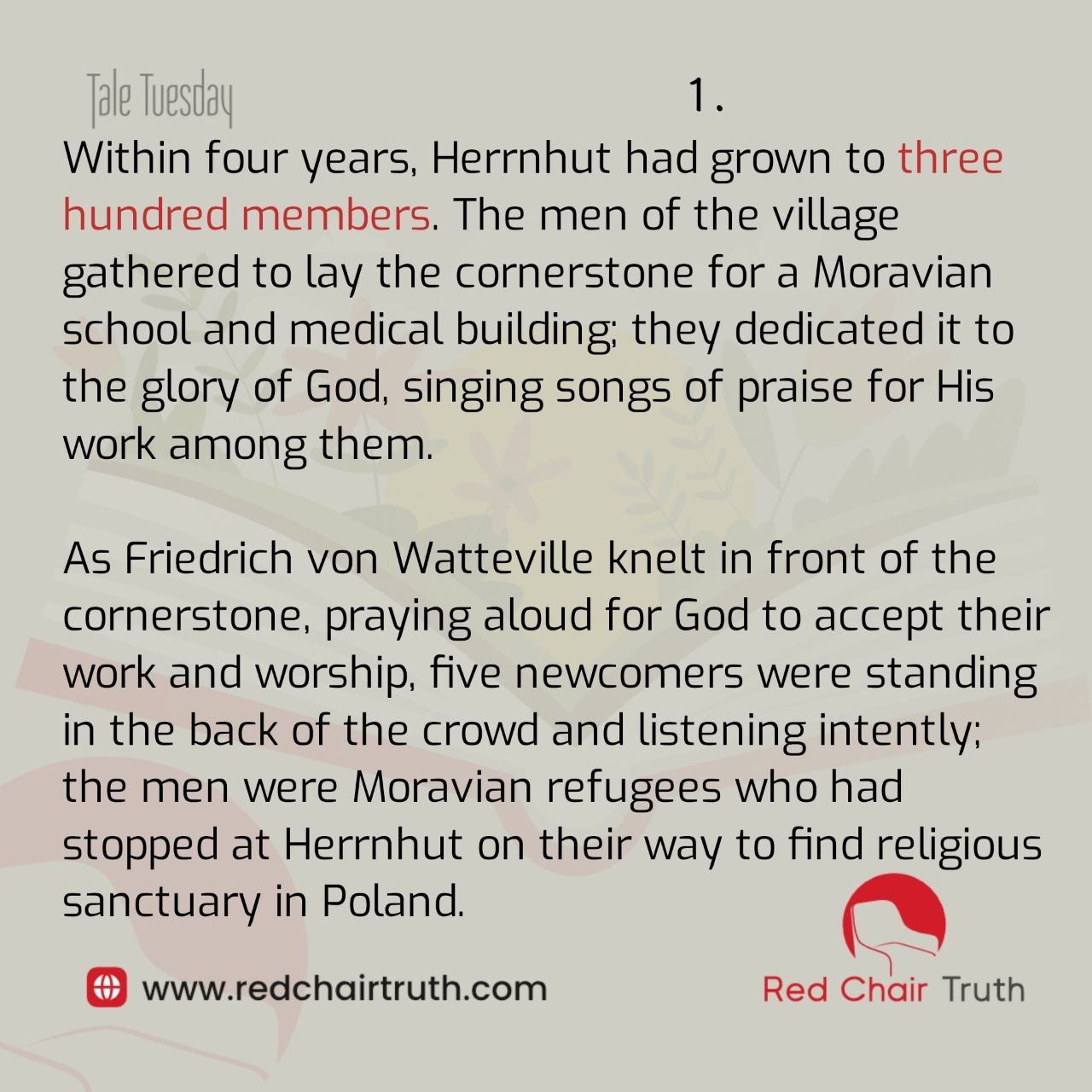 Within four years, Herrnhut had grown to three hundred members. The men of the village gathered to lay the cornerstone for a Moravian school and medical building; they dedicated it to the glory of God, singing songs of praise for His work among them. As Friedrich von Watteville knelt in front of the cornerstone, praying aloud for God to accept their work and worship, five newcomers were standing in the back of the crowd and listening intently; the men were Moravian refugees who had stopped at Herrnhut on their way to find religious sanctuary in Poland.