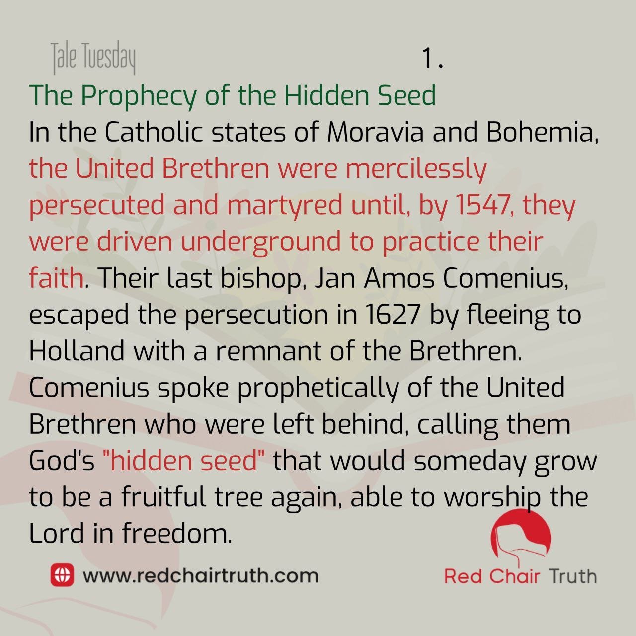 In the Catholic states of Moravia and Bohemia, the United Brethren were mercilessly persecuted and martyred until, by 1547, they were driven underground to practice their faith. Their last bishop, Jan Amos Comenius, escaped the persecution in 1627 by fleeing to Holland with a remnant of the Brethren. Comenius spoke prophetically of the United Brethren who were left behind, calling them God’s “hidden seed” that would someday grow to be a fruitful tree again, able to worship the Lord in freedom.