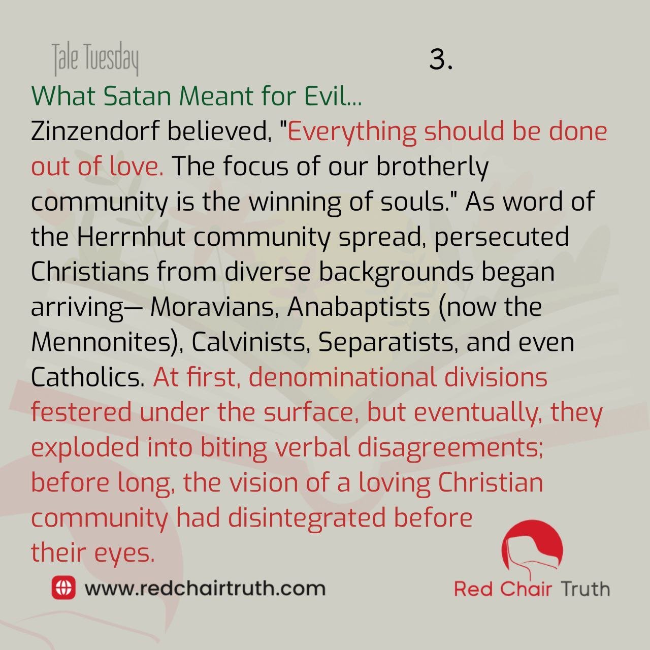 Zinzendorf believed, “Everything should be done out of love. The focus of our brotherly community is the winning of souls.” As word of the Herrnhut community spread, persecuted Christians from diverse backgrounds began arriving- Moravians, Anabaptists (now the Mennonites), Calvinists, Separatists, and even Catholics. At first, denominational divisions festered under the surface, but eventually, they exploded into biting verbal disagreements; before long, the vision of a loving Christian community had disintegrated before their eyes.