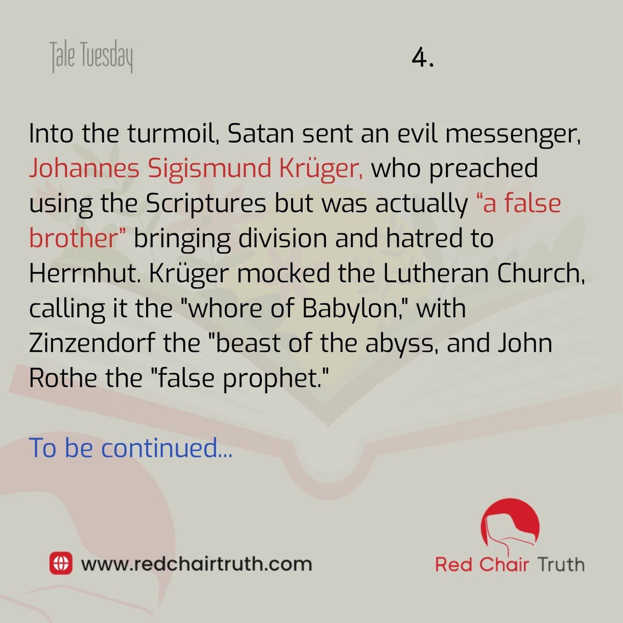 Into the turmoil, Satan sent an evil messenger, Johannes Sigismund Krüger, who preached using the Scriptures but was actually “a false brother” bringing division and hatred to Herrnhut. Krüger mocked the Lutheran Church, calling it the “whore of Babylon,” with Zinzendorf the “beast of the abyss, and John Rothe the “false prophet.”