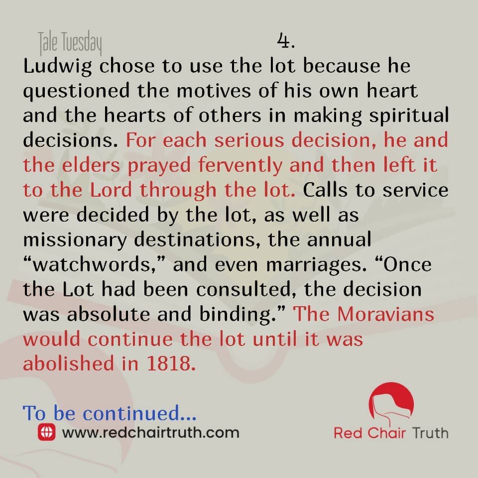 Ludwig chose to use the lot because he questioned the motives of his own heart and the hearts of others in making spiritual decisions. For each serious decision, he and the elders prayed fervently and then left it to the Lord through the lot. Calls to service were decided by the lot, as well as missionary destinations, the annual “watchwords,” and even marriages. “Once the Lot had been consulted, the decision was absolute and binding.” The Moravians would continue the lot until it was abolished in 1818.