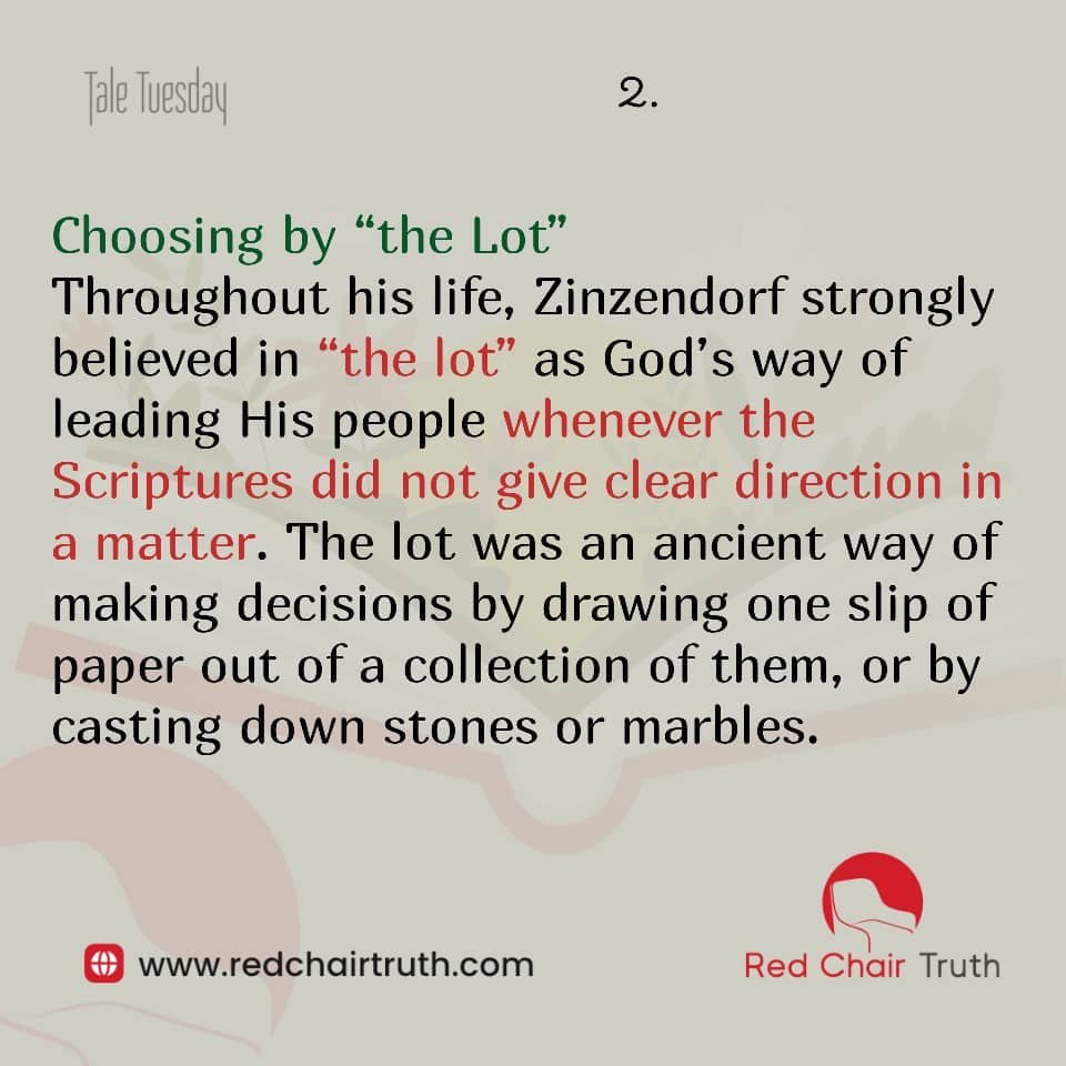 Throughout his life, Zinzendorf strongly believed in “the lot” as God’s way of leading His people whenever the Scriptures did not give clear direction in a matter. The lot was an ancient way of making decisions by drawing one slip of paper out of a collection of them, or by casting down stones or marbles.