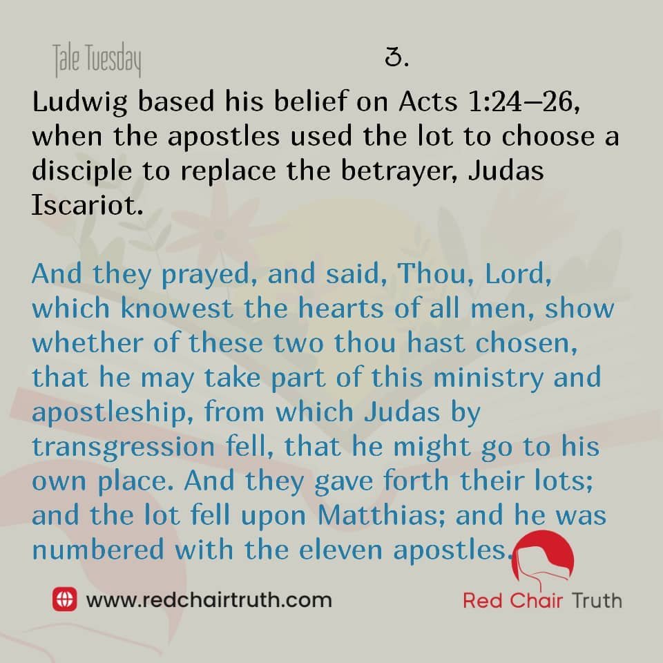 Ludwig based his belief on Acts 1:24–26, when the apostles used the lot to choose a disciple to replace the betrayer, Judas Iscariot. And they prayed, and said, Thou, Lord, which knowest the hearts of all men, show whether of these two thou hast chosen, that he may take part of this ministry and apostleship, from which Judas by transgression fell, that he might go to his own place. And they gave forth their lots; and the lot fell upon Matthias; and he was numbered with the eleven apostles.