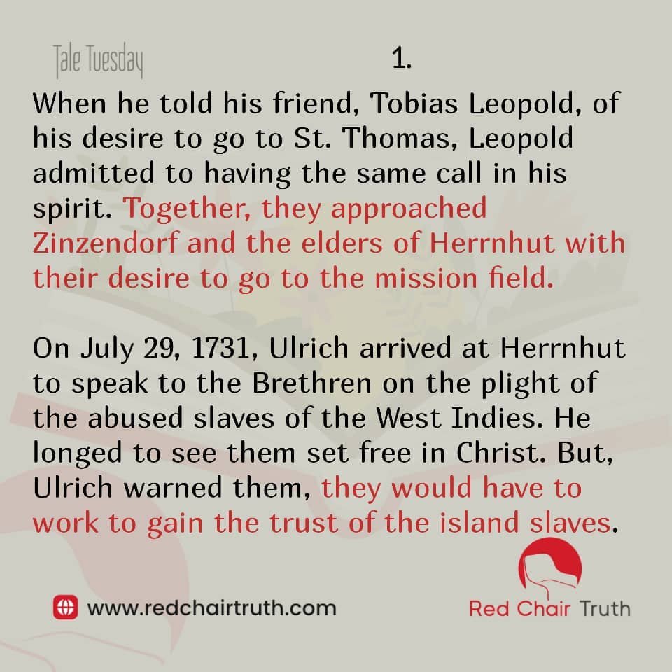 When he told his friend, Tobias Leopold, of his desire to go to St. Thomas, Leopold admitted to having the same call in his spirit. Together, they approached Zinzendorf and the elders of Herrnhut with their desire to go to the mission field. On July 29, 1731, Ulrich arrived at Herrnhut to speak to the Brethren on the plight of the abused slaves of the West Indies. He longed to see them set free in Christ. But, Ulrich warned them, they would have to work to gain the trust of the island slaves.
