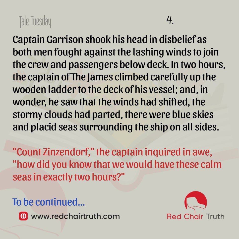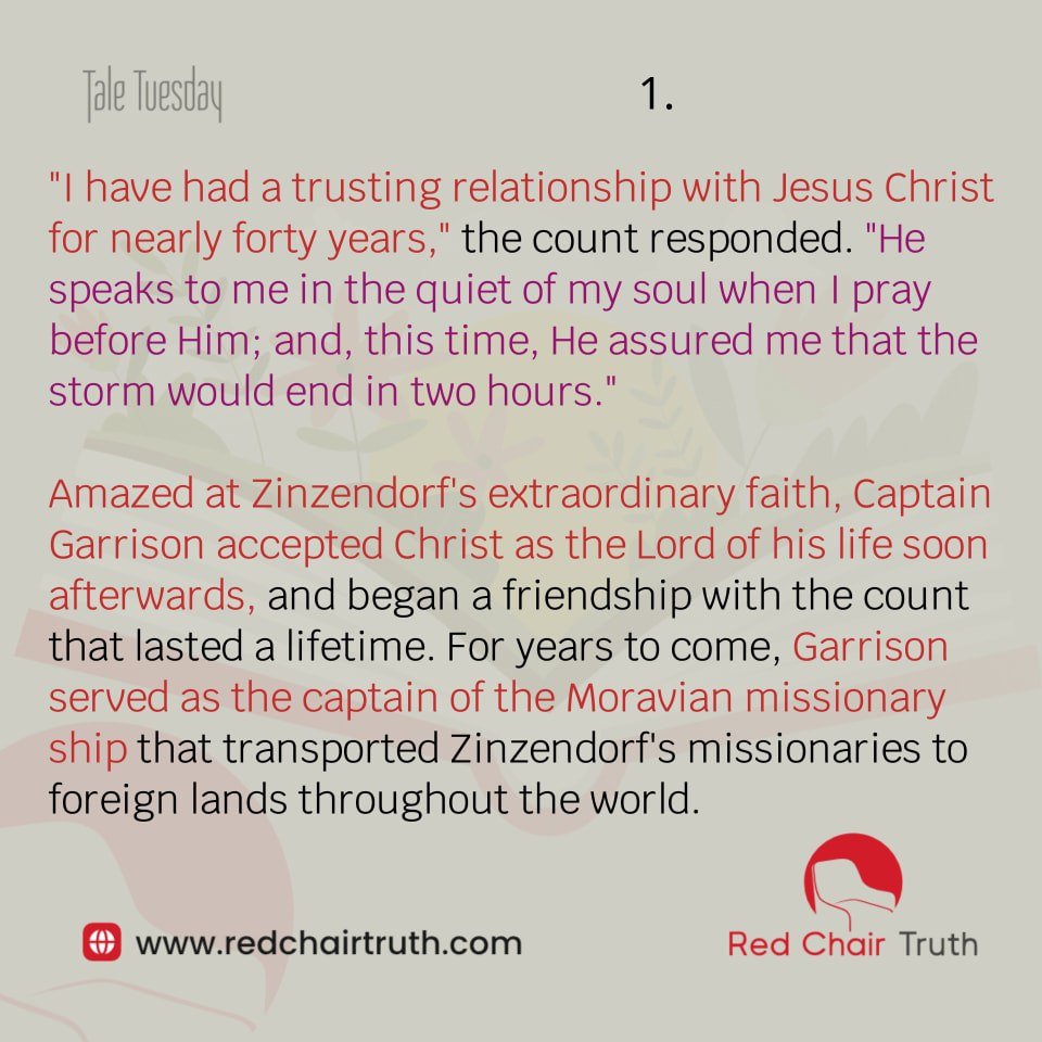 “I have had a trusting relationship with Jesus Christ for nearly forty years,” the count responded. “He speaks to me in the quiet of my soul when I pray before Him; and, this time, He assured me that the storm would end in two hours.” Amazed at Zinzendorf’s extraordinary faith, Captain Garrison accepted Christ as the Lord of his life soon afterwards, and began a friendship with the count that lasted a lifetime. For years to come, Garrison served as the captain of the Moravian missionary ship that transported Zinzendorf’s missionaries to foreign lands throughout the world.