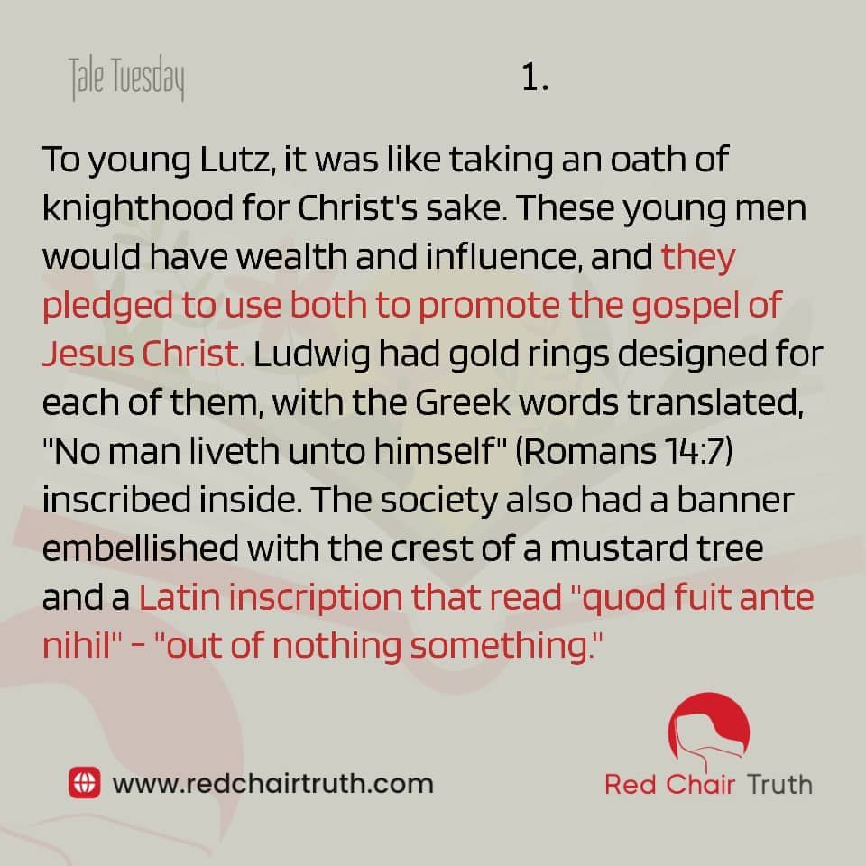 To young Lutz, it was like taking an oath of knighthood for Christ’s sake. These young men would have wealth and influence, and they pledged to use both to promote the gospel of Jesus Christ. Ludwig had gold rings designed for each of them, with the Greek words translated, “No man liveth unto himself” (Romans 14:7) inscribed inside. The society also had a banner embellished with the crest of a mustard tree and a Latin inscription that read “quod fuit ante nihil” – “out of nothing something.”