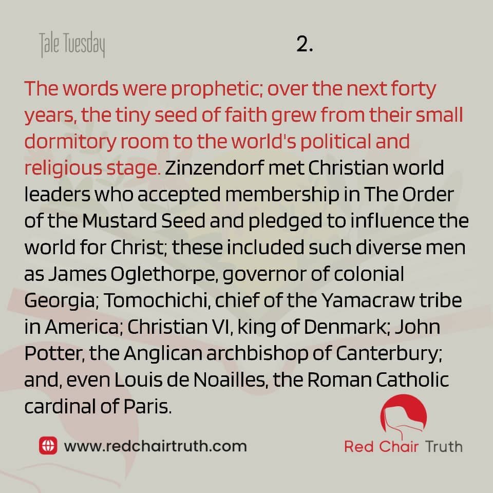 The words were prophetic; over the next forty years, the tiny seed of faith grew from their small dormitory room to the world’s political and religious stage. Zinzendorf met Christian world leaders who accepted membership in The Order of the Mustard Seed and pledged to influence the world for Christ; these included such diverse men as James Oglethorpe, governor of colonial Georgia; Tomochichi, chief of the Yamacraw tribe in America; Christian VI, king of Denmark; John Potter, the Anglican archbishop of Canterbury; and, even Louis de Noailles, the Roman Catholic cardinal of Paris.