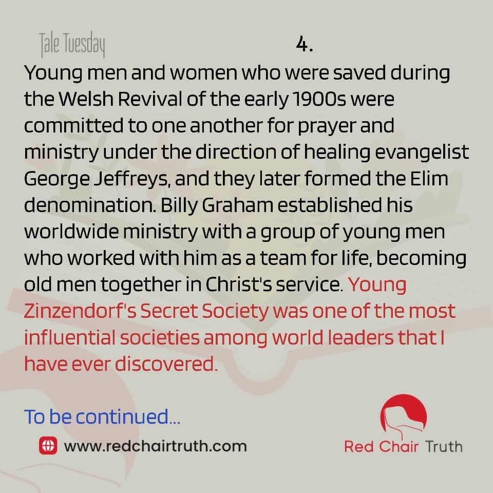 Young men and women who were saved during the Welsh Revival of the early 1900s were committed to one another for prayer and ministry under the direction of healing evangelist George Jeffreys, and they later formed the Elim denomination. Billy Graham established his worldwide ministry with a group of young men who worked with him as a team for life, becoming old men together in Christ’s service. Young Zinzendorf’s Secret Society was one of the most influential societies among world leaders that I have ever discovered.