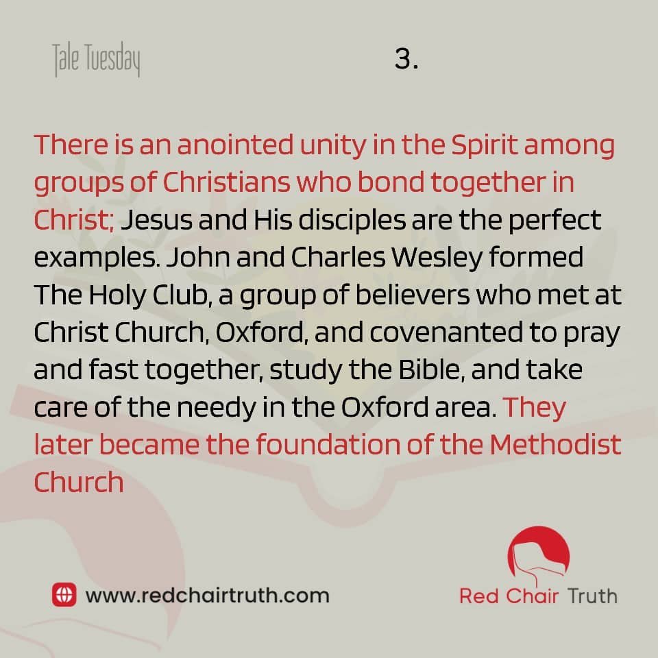 There is an anointed unity in the Spirit among groups of Christians who bond together in Christ; Jesus and His disciples are the perfect examples. John and Charles Wesley formed The Holy Club, a group of believers who met at Christ Church, Oxford, and covenanted to pray and fast together, study the Bible, and take care of the needy in the Oxford area. They later became the foundation of the Methodist Church.