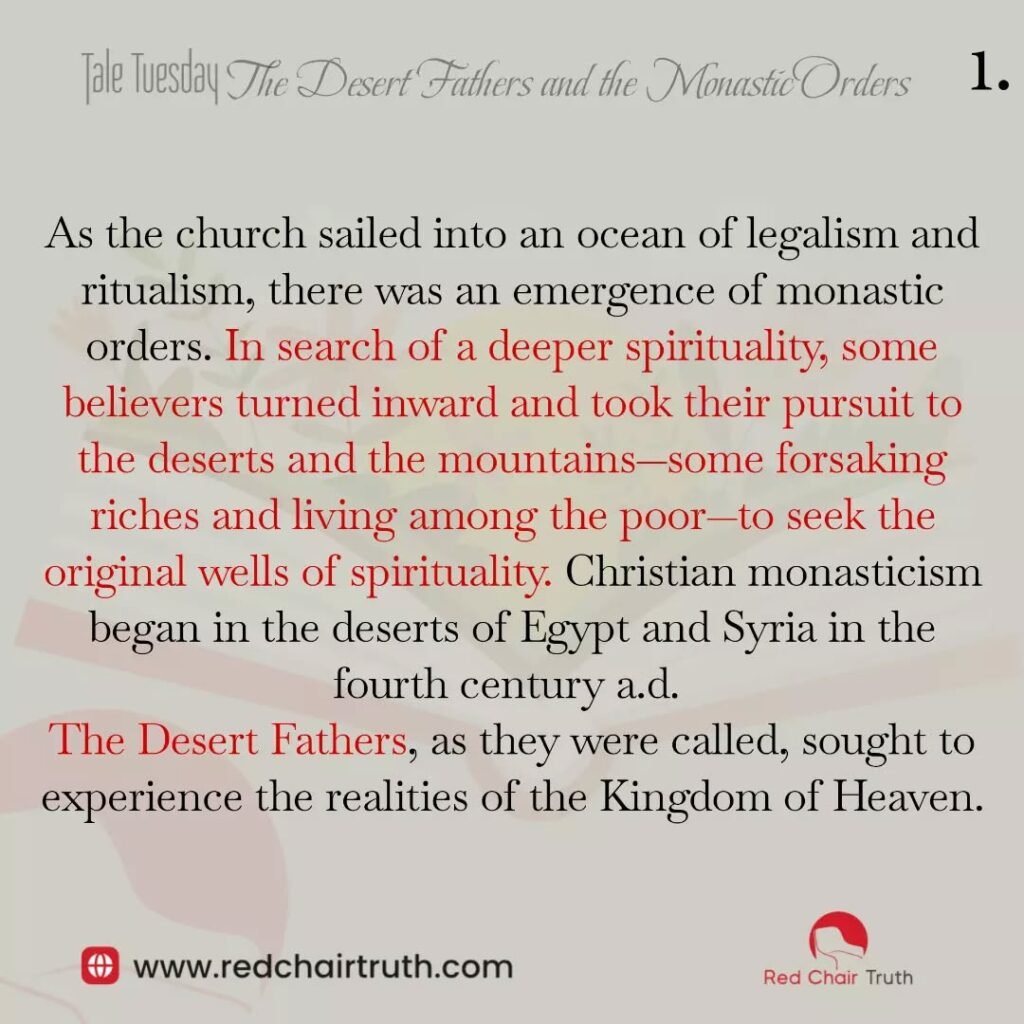 As the church sailed into an ocean of legalism and ritualism, there was an emergence of monastic orders. In search of a deeper spirituality, some believers turned inward and took their pursuit to the deserts and the mountains-some forsaking riches and living among the poor-to seek the original wells of spirituality.