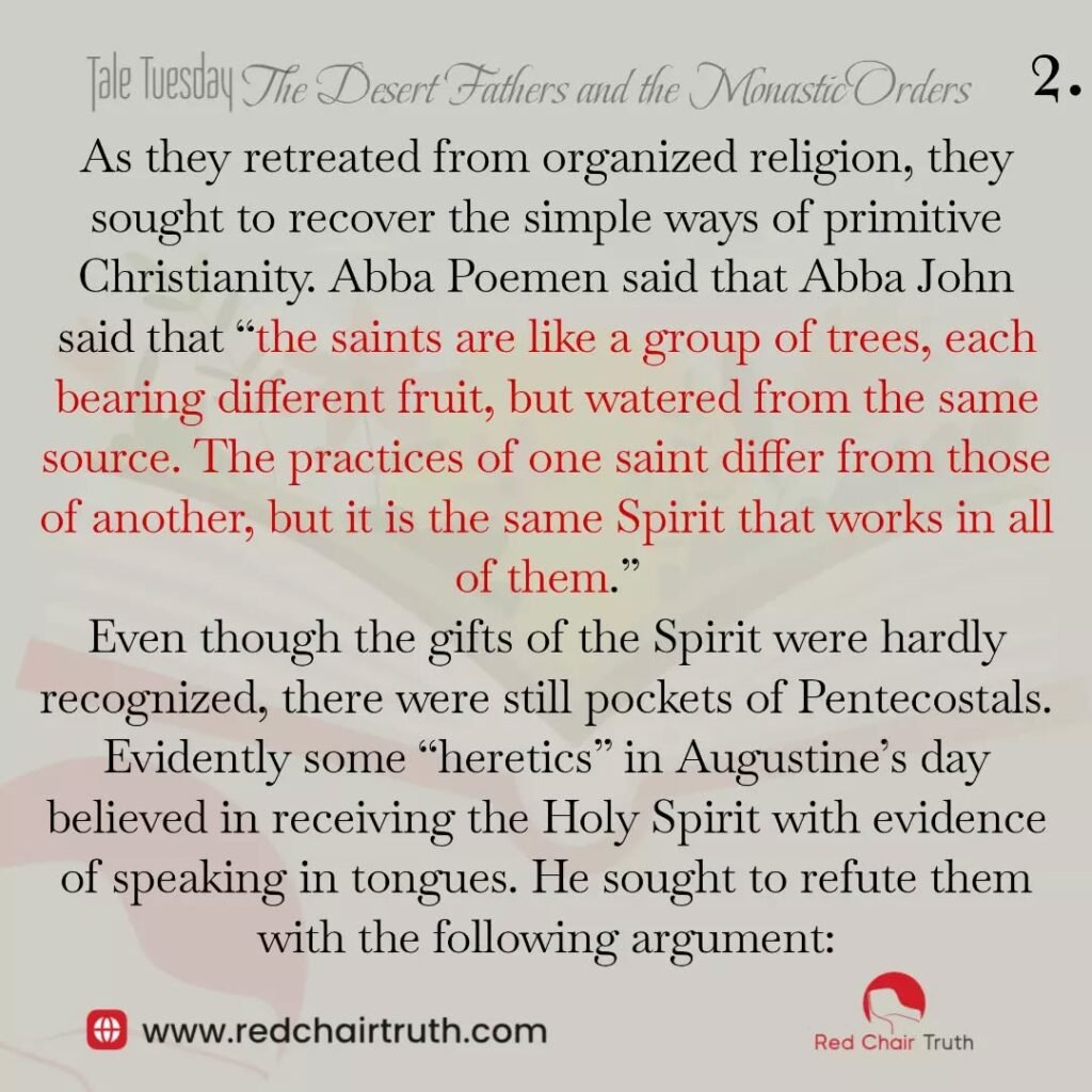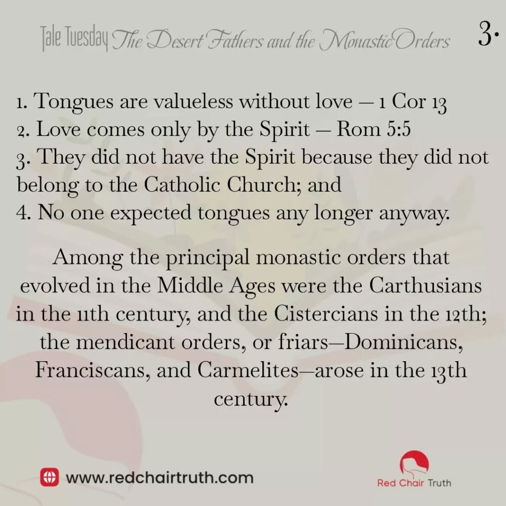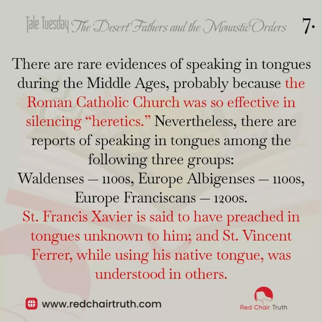Even though the gifts of the Spirit were hardly recognized, there were still pockets of Pentecostals. Evidently some “heretics” in Augustine’s day believed in receiving the Holy Spirit with evidence of speaking in tongues. He sought to refute them with the following argument: 1. Tongues are valueless without love – 1 Cor 13 2. Love comes only by the Spirit – Rom 5:5 3. They did not have the Spirit because they did not belong to the Catholic Church; and 4. No one expected tongues any longer anyway.